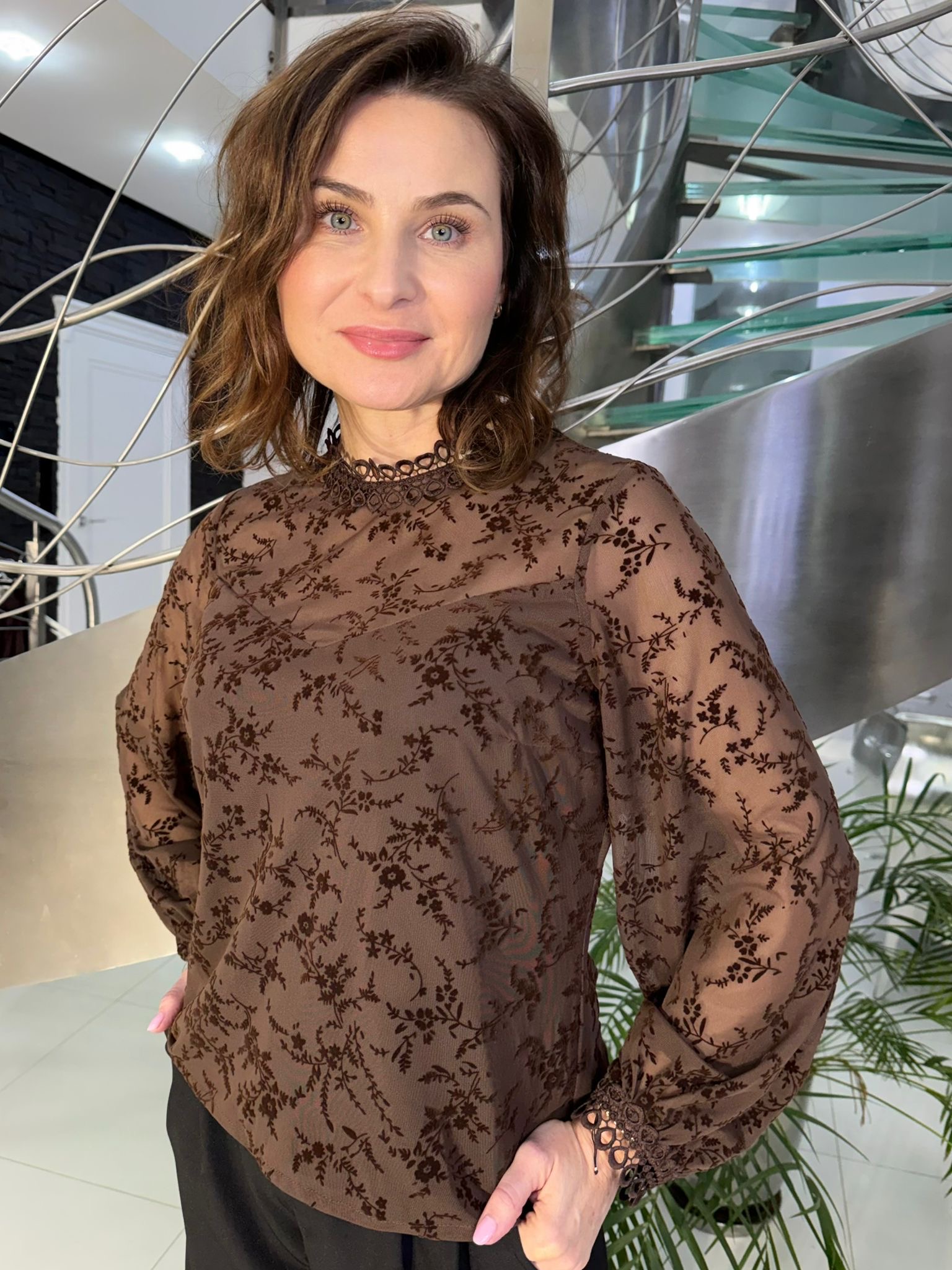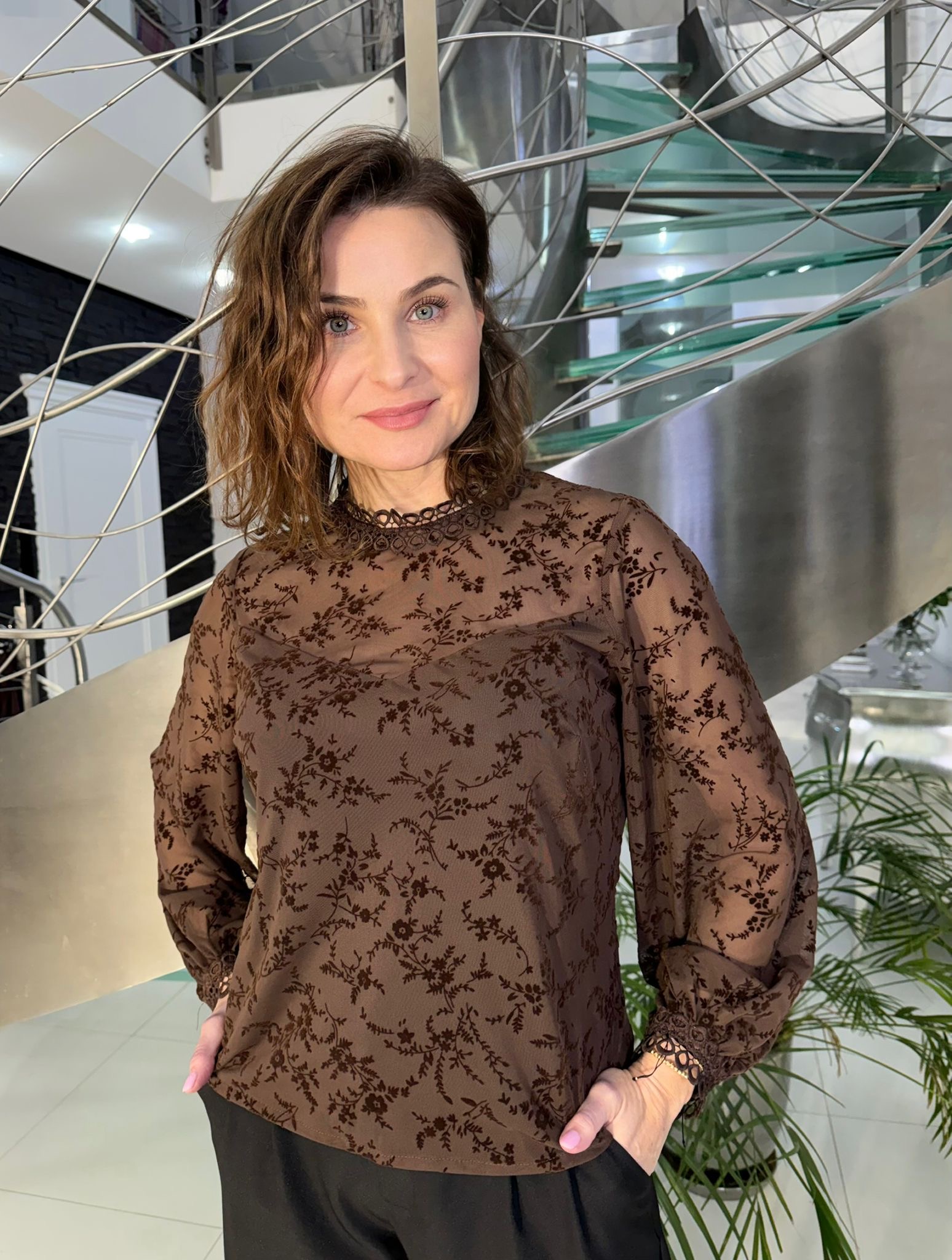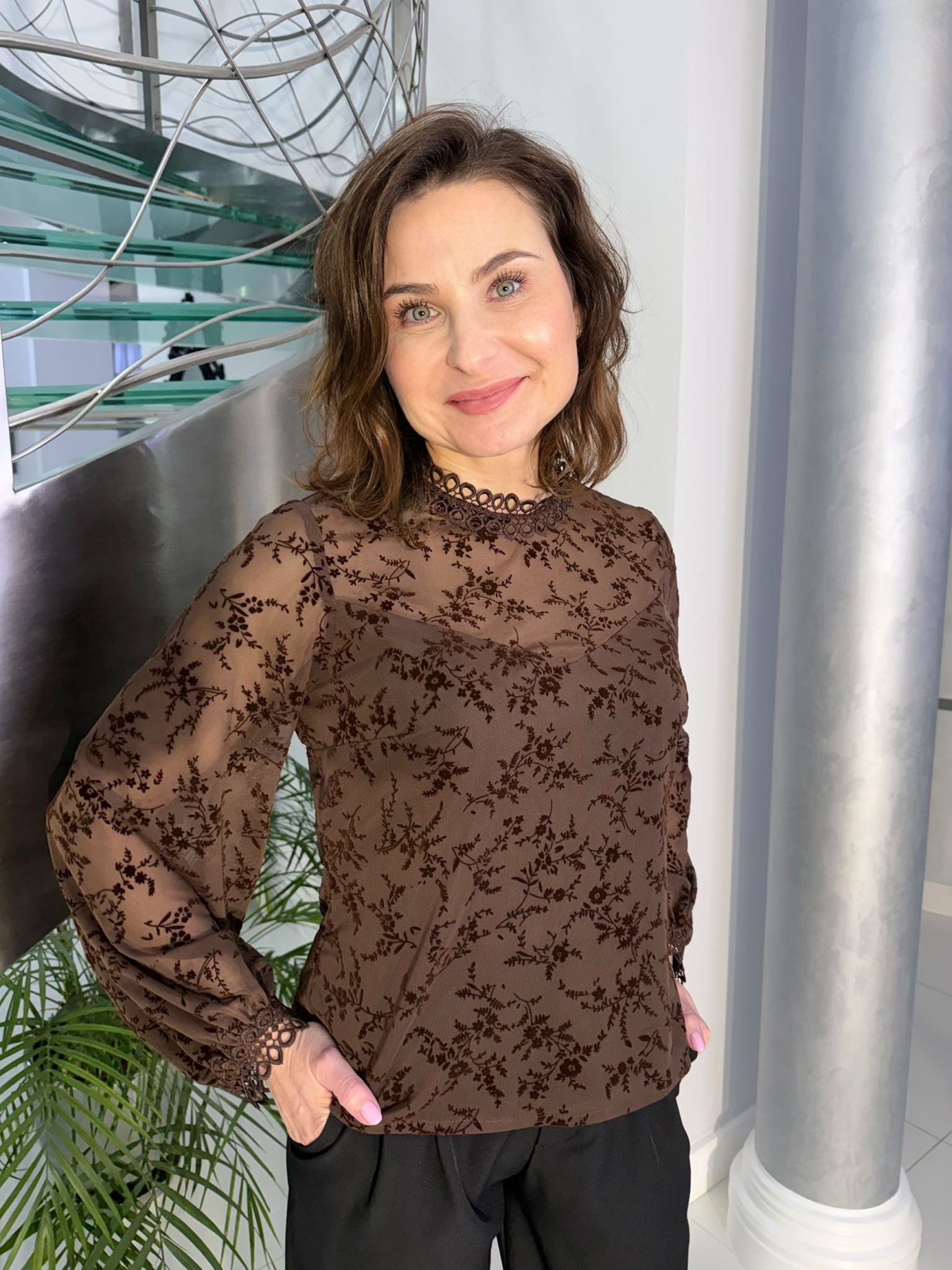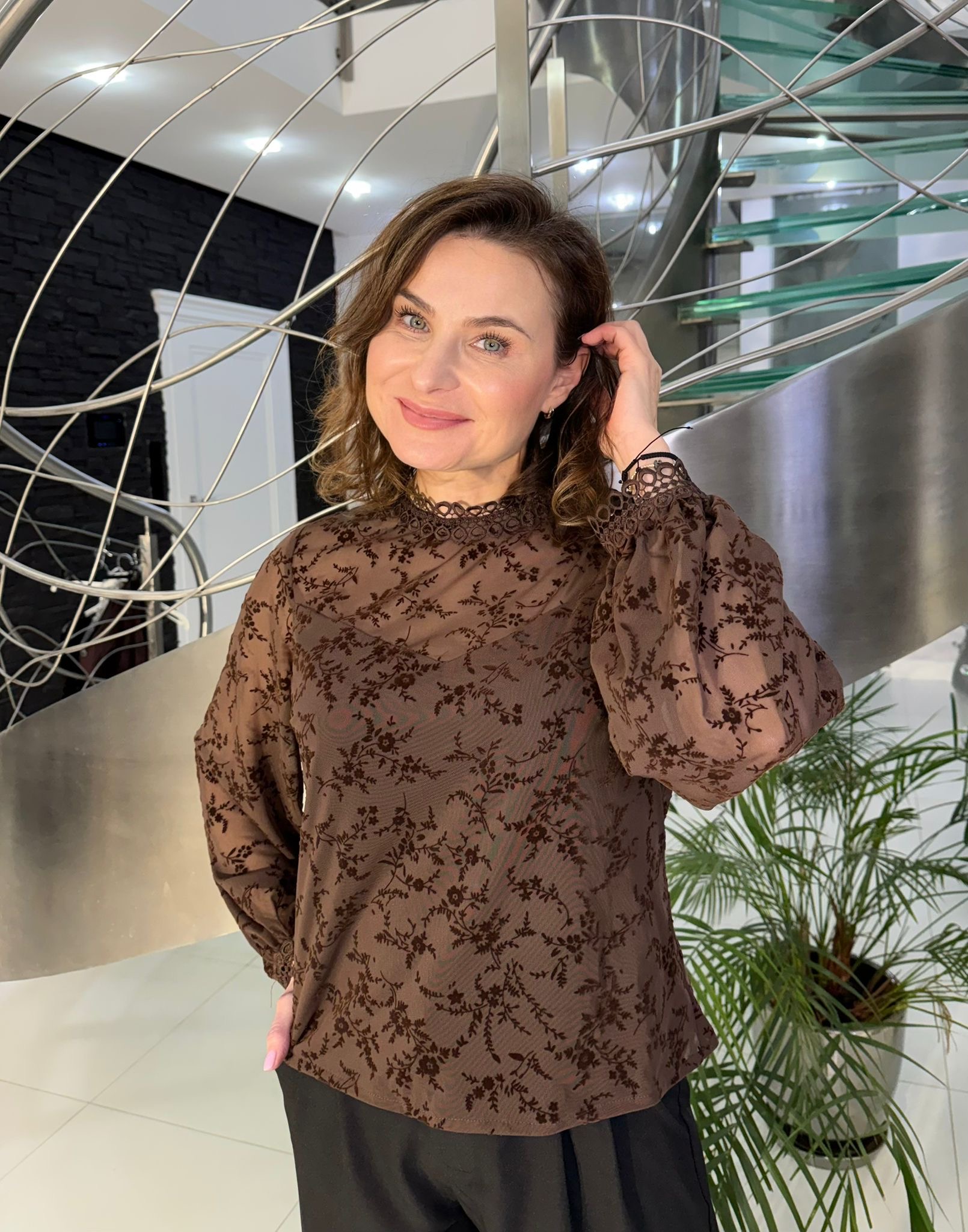 Model doskonale sprawdzi się zarówno w codziennych stylizacjach, jak i na eleganckie okazje – do pracy, na spotkania czy wieczorne wyjścia. Subtelna brązowa siateczka, połączona z koronkowymi detalami, nadaje bluzce nowoczesnego, kobiecego charakteru i pozwala wyróżnić się w każdej stylizacji.