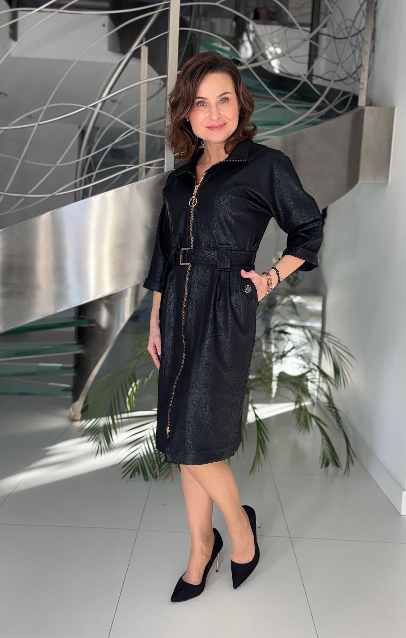 Odkryj ponadczasowy szyk z naszą elegancką sukienką zapinaną na zamek po całej długości. Model z kołnierzykiem i paskiem w talii pięknie podkreśla kobiecą sylwetkę, nadając jej lekkości i elegancji. Sukienka posiada rękawy 3/4 oraz praktyczne kieszenie, które dodają jej funkcjonalności i nowoczesnego charakteru.