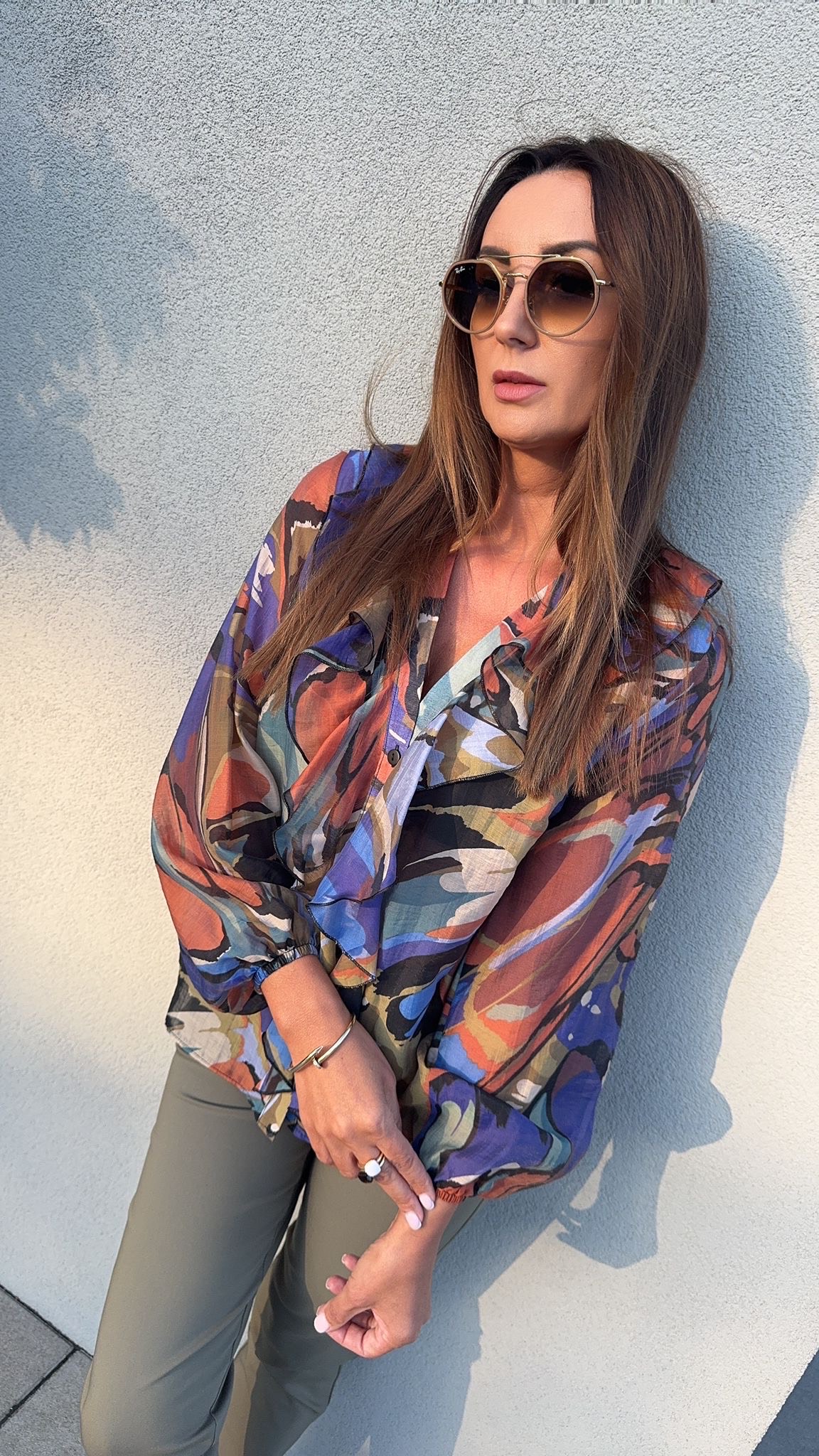Wprowadź kolor do swojej garderoby dzięki tej stylowej, multikolorowej bluzce z żabotem. Wyróżnia się modnym wzorem oraz funkcjonalnym krojem – rozpinana na guziki.