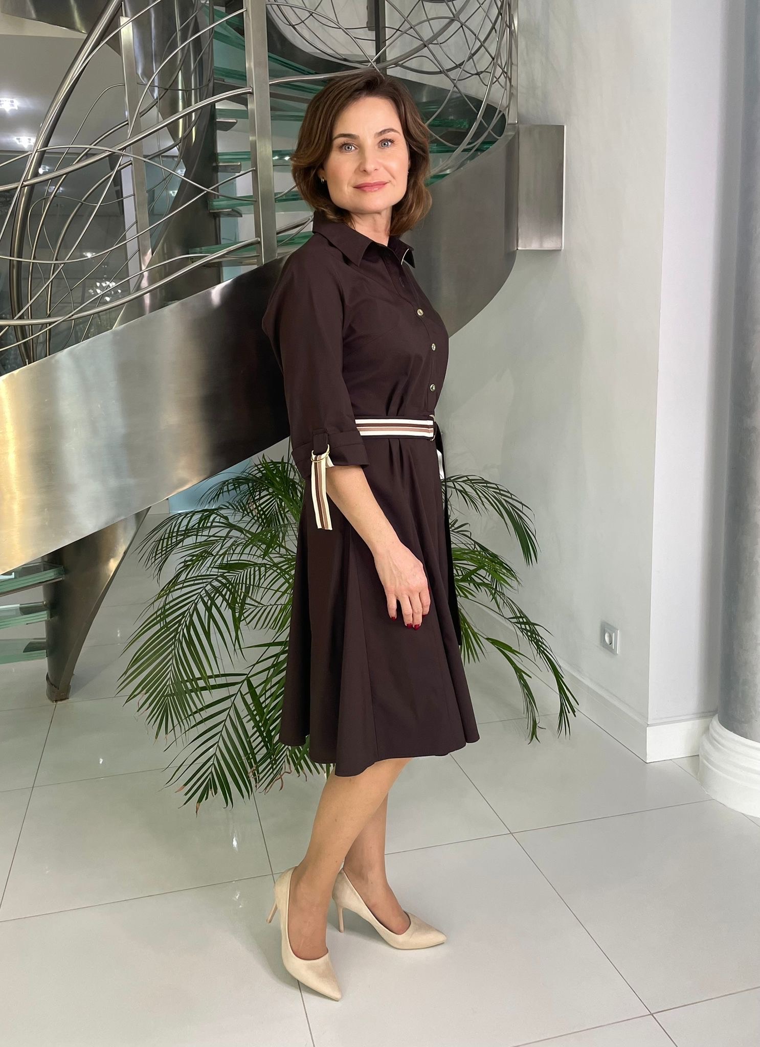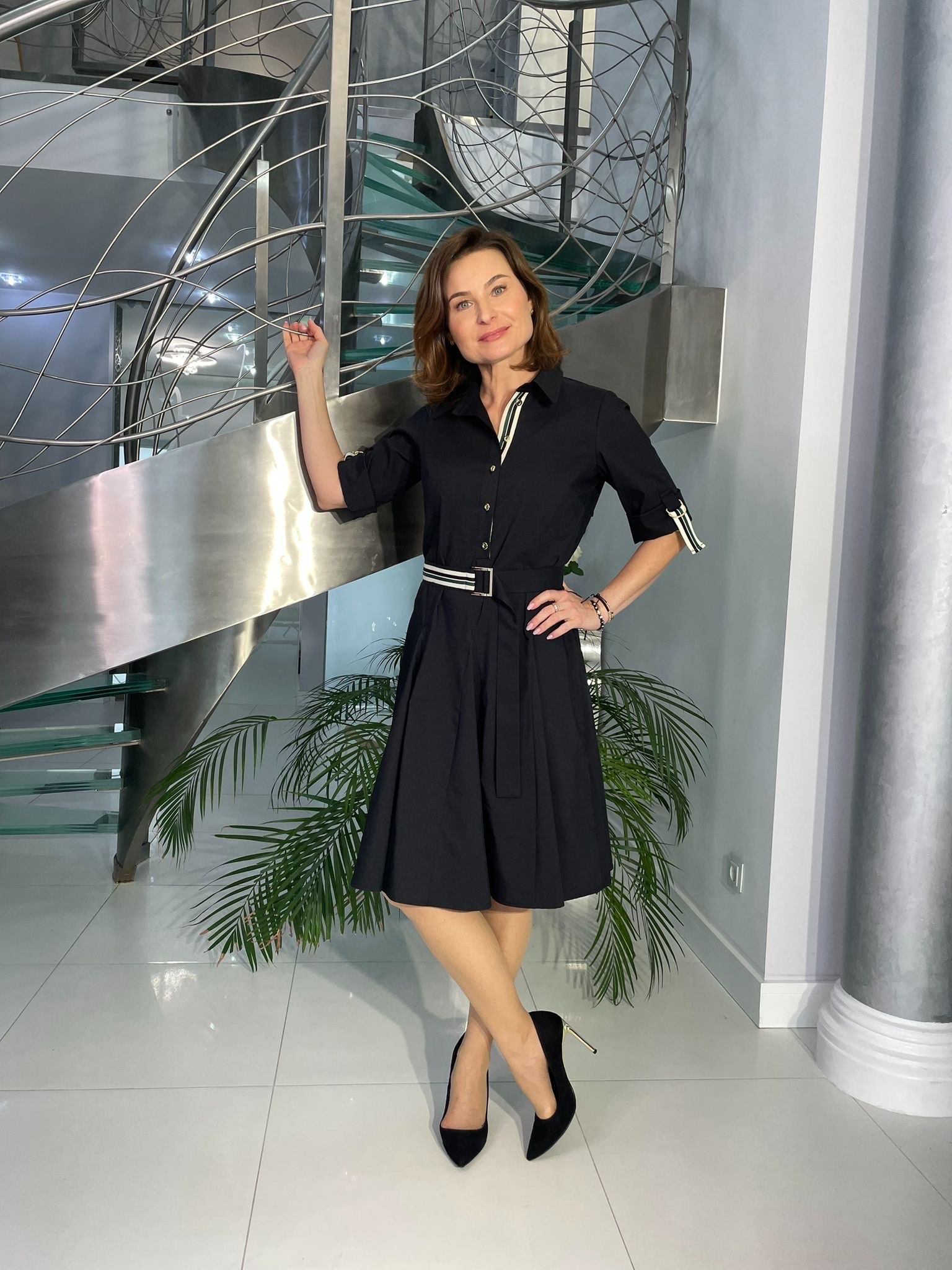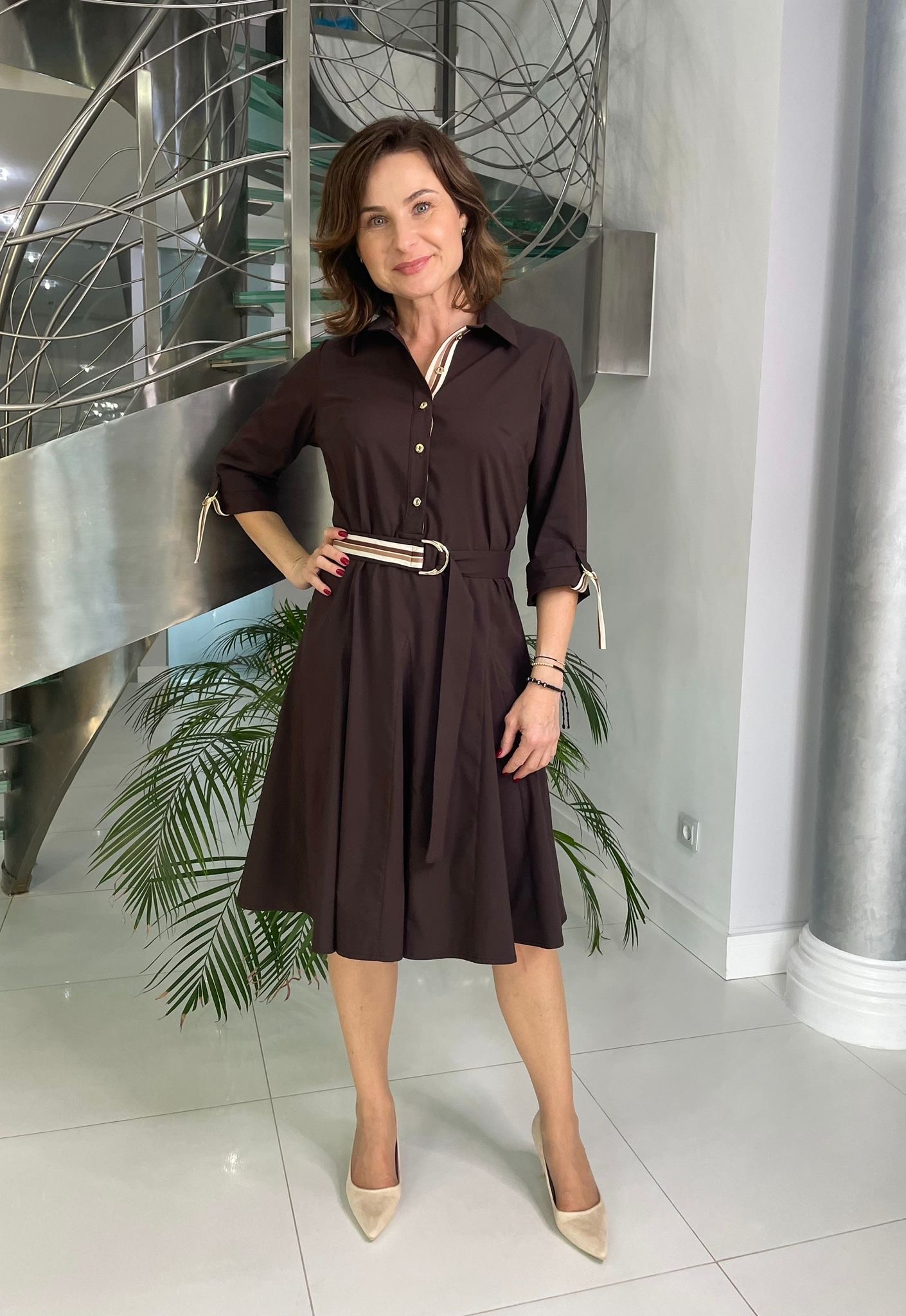 Sukienka Aurelia to idealna propozycja dla kobiet, które cenią sobie klasyczną elegancję w nowoczesnym wydaniu. Model zapinany na guziki do pasa, z kołnierzykiem i modnymi wiązaniami przy rękawach o długości 3/4, zakończonymi stylowymi mankietami z lamówką w paski.