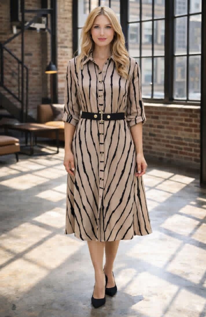Sukienka koszulowa z kołnierzykiem, rozpinana na całej długości. Taliowany fason, lekko rozkloszowany dół. Mankiety i pasek w kontrastowym kolorze. Print wiskozowej tkaniny wyszczupla sylwetkę. Sukienka jest lekka i komfortowa w noszeniu. Uniwersalna elegancja i ponadczsowy styl sukienki sprawiają iż można nosić ją na różne okazje – świąteczne i codzienne. Dobrze będzie prezentować się ze szpilkami, sandałami, klapkami a nawet tenisówkami.